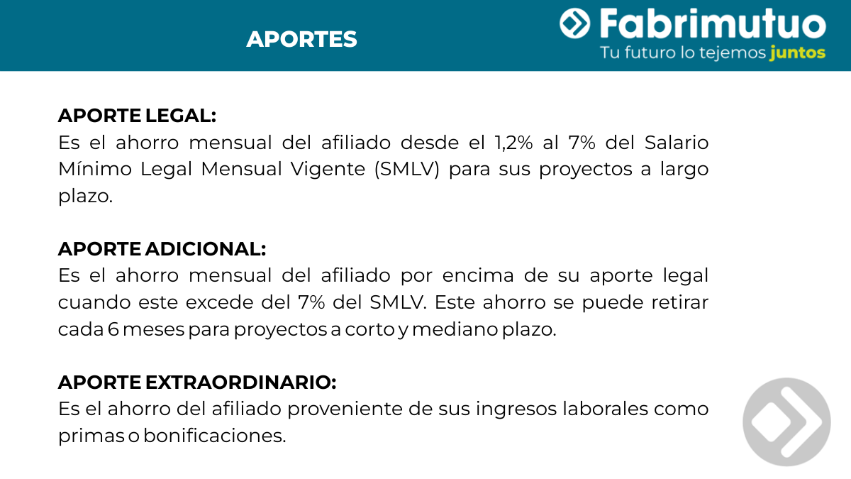 Aporte legal (el básico definido por la empresa), aporte adicional (lo que decidas ahorrar por encima del legal) y aporte extraordinario (como primas y bonificaciones).
