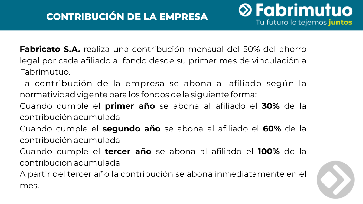 Desde tu ingreso la empresa ya aporta el 50%. Para que ese dinero sea completamente tuyo: A los 12 meses recibes el 30%, a los 24 meses el 60% y a los 36 meses el 100%.